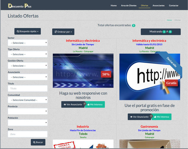 Los visitantes del portal Descuento Plus pueden buscar ofertas rápidamente por provincias y afinar luego el resultado de busqueda. Al pinchar en el boton me interesa de una oferta reciben la oferta junto con un código QR en su cuenta de correo. El código QR se presenta en las tiendas válidas de la oferta en cuestión.
